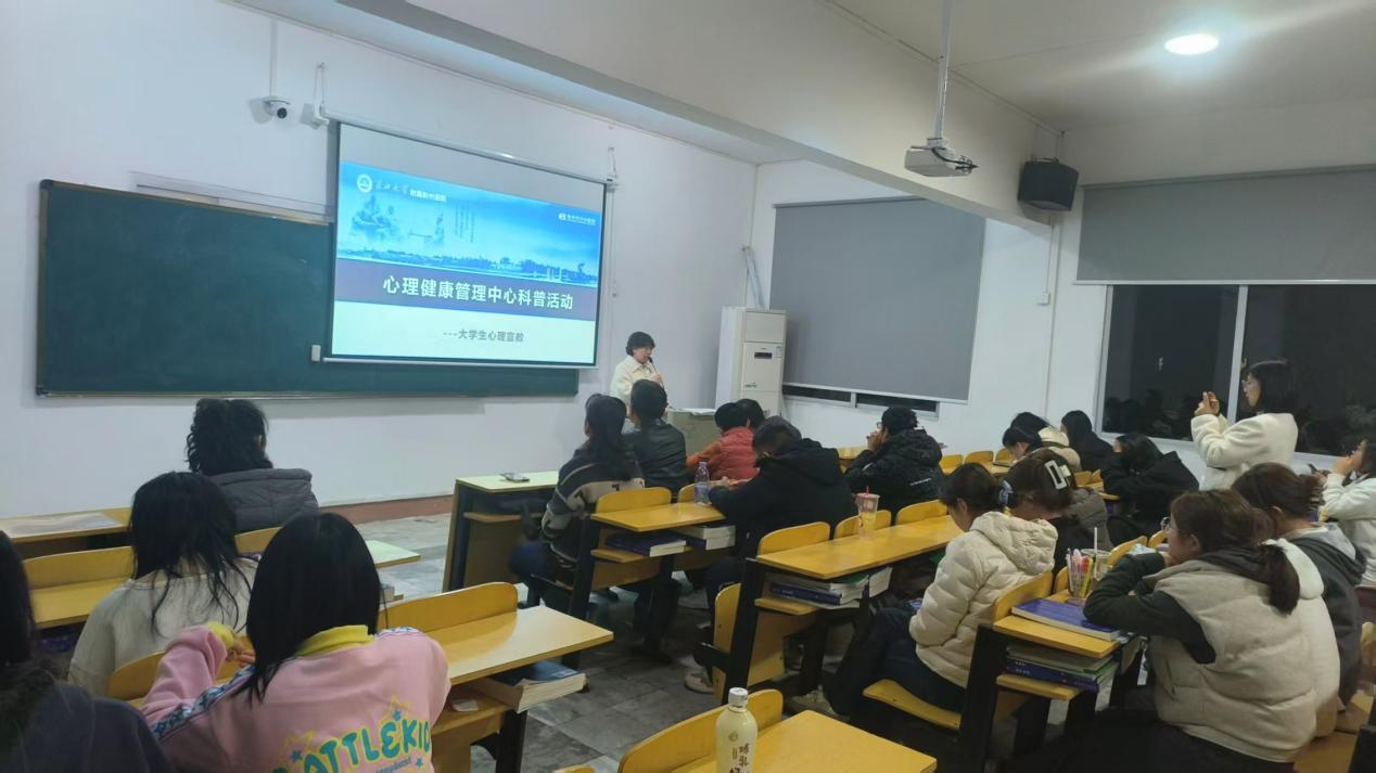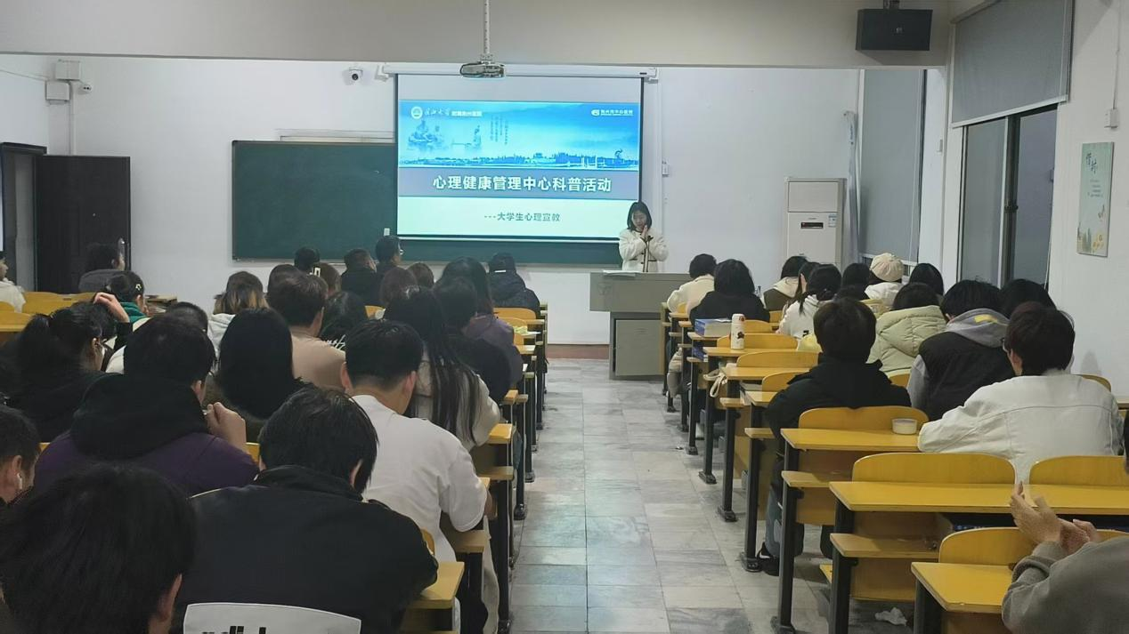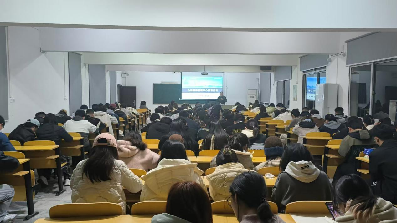 讲座伊始,学院心理专干胡鹏飞老师就校园心理健康管理中心的服务体系进行了系统介绍。他重点解读了中心构建的“学校—院部—班级—寝室”四级心理服务网络,强调心理健康关怀需要全员参与,鼓励同学们既要做好自我心理关照,也要主动成为校园心理支持的传递者,共同织密温暖坚实的校园心理安全防护网。
