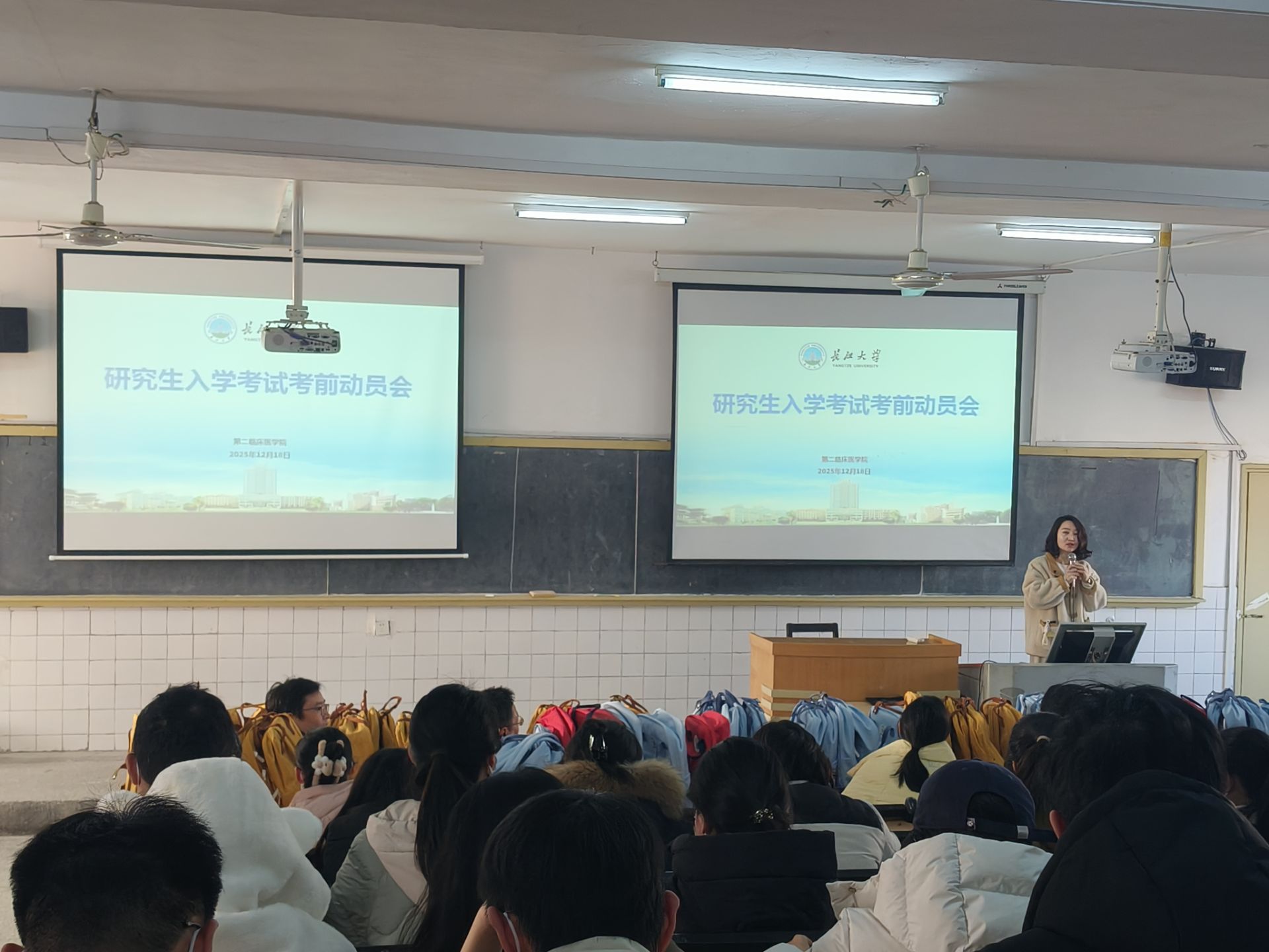 2025年12月18日下午,第二临床医学院在实训楼601教室召开21级考研学子考前动员暨助力大会。学院党委副书记姜邵捷、全体辅导员及班主任参加会议,会议由辅导员赵雪冰老师主持,全体21级即将踏上研究生考试征程的学子参会,共同为冲刺考研凝聚力量、提振信心。