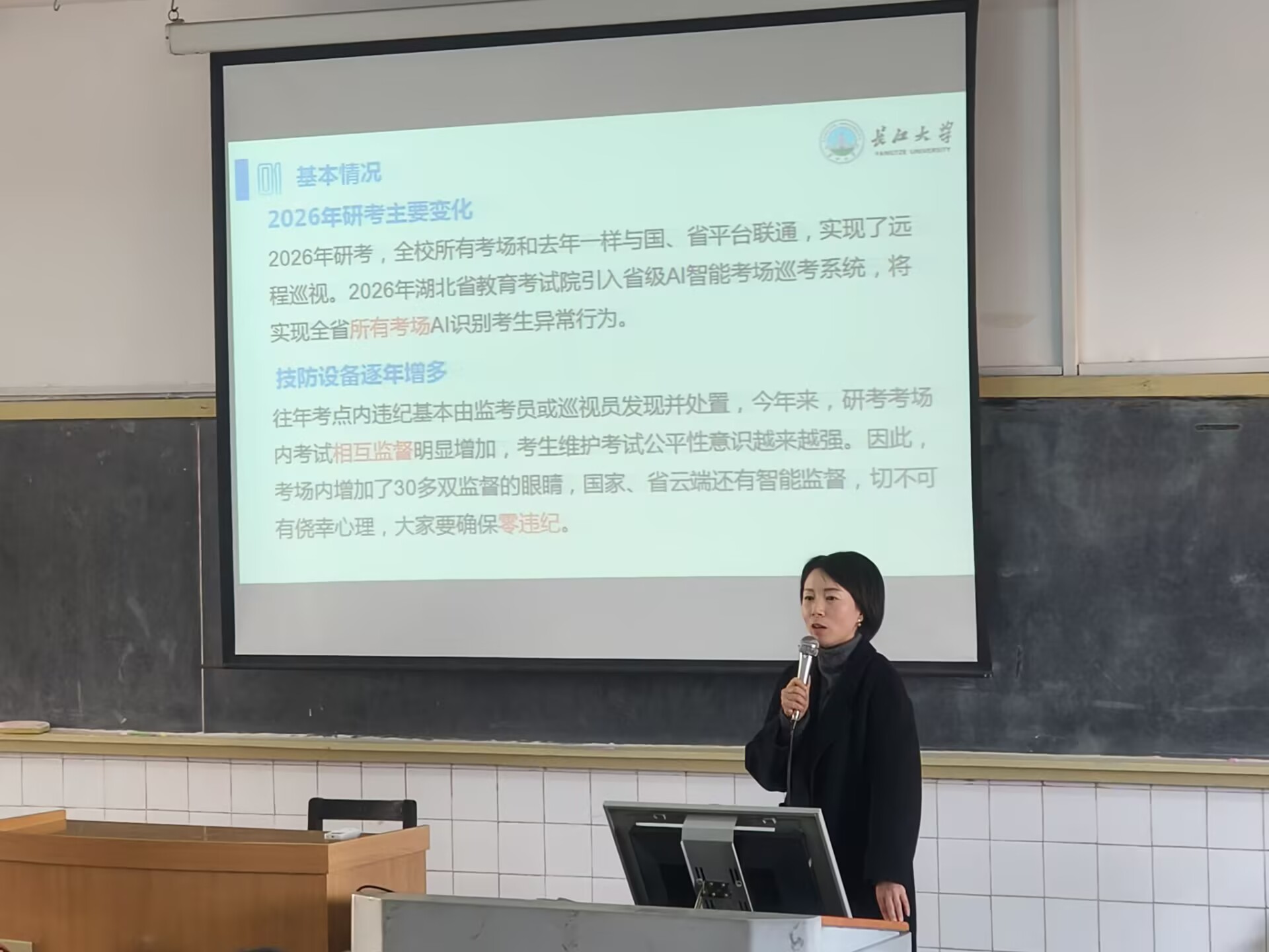会议伊始,周小淳老师结合最新研究生考试政策及考务要求,对考试相关规定进行了全面细致的讲解,特别强调了诚信考试的重要性,提醒同学们严格遵守考试纪律,杜绝任何违规违纪行为。