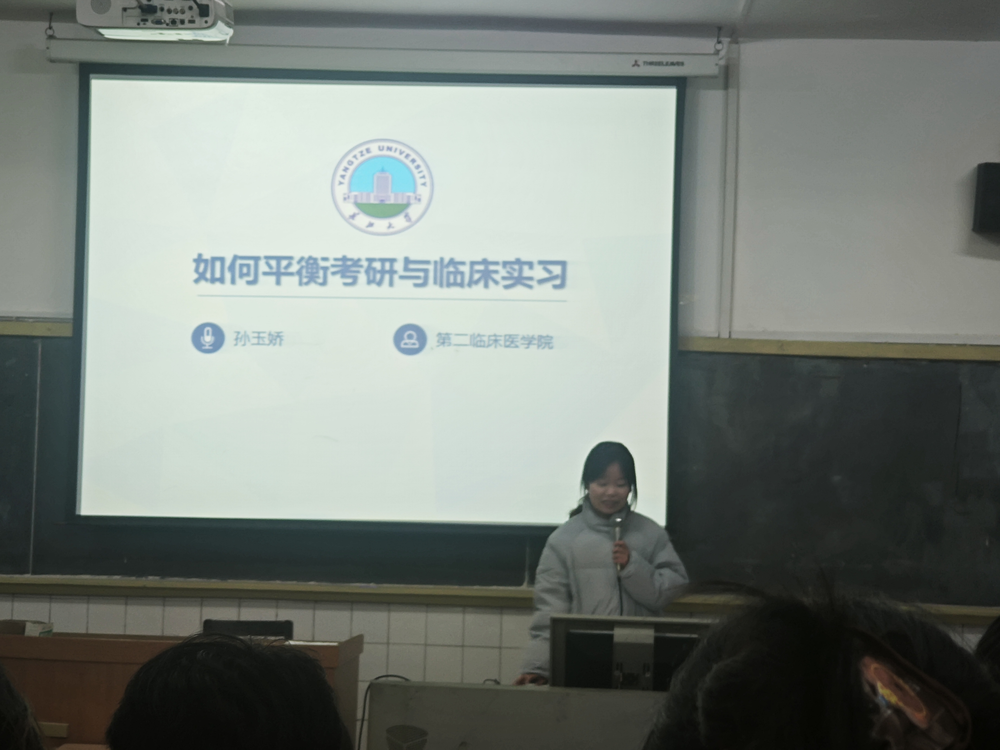 活动伊始,孙玉娇学姐分享实战经验。她梳理了考研全年时间线,推荐了主流授课老师及学习方法,提出实习期间注意事项。她强调实习经历的重要性,鼓励多向导师请教专业知识与前沿动态,同时分享了医考帮、不背单词等实用学习资源。周老师补充提醒,学生需科学规划时间,考研后仍需强化实习与复试准备。
