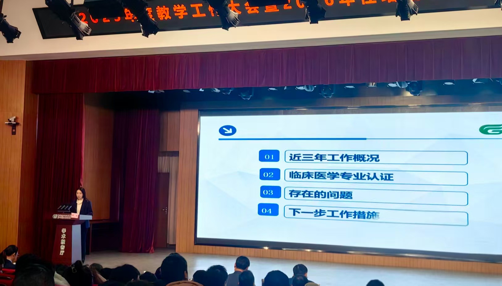 在教学工作汇报环节,教学管理办公室、学生工作科分别总结回顾了2025年工作成绩,从临床医学专业认证申请流程、临床医学专业认证准入指标以及专家入校现场检查的准备工作等三个方面,对临床医学专业认证工作进行了解读。同时,就迎接认证的各项工作进行了分工布置。