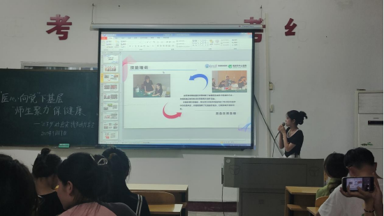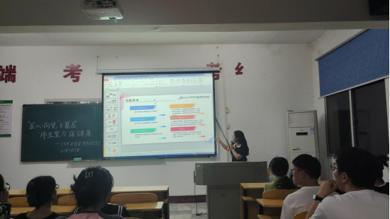 本次活动由“三下乡”活动成员张颖和杨菁主持,活动由三部分组成,分别为活动介绍、成果分享和总结感悟。为深入学习宣传习近平新时代中国特色社会主义思想,引导和帮助广大青年学生上好与现实相结合的“大思政课”,在社会课堂中“受教育、长才干、作贡献”,长江大学第二临床医学院的“医心向阳,护航乡村”暑期社会实践志愿者团队于2023年8月20日出发前往松滋市卸甲坪土家族乡,开展“三下乡”健康巡讲义诊活动。在本次义诊活动中,志愿者们共测量血糖144人次,测量血压150人次,发放药物233份、问卷调查152份、宣传手册690册,入户走访2户。活动结束后志愿者们也表示“祖国需要处,皆是我故乡。”作为新时代的新青年,希望我们不仅能向上生长,也要向下扎根,为基层卫生服务建设贡献自己的力量,把青春和热血挥洒在祖国需要的地方。最后向同学们展示了活动的视频,让大家对本次活动有更深的了解。