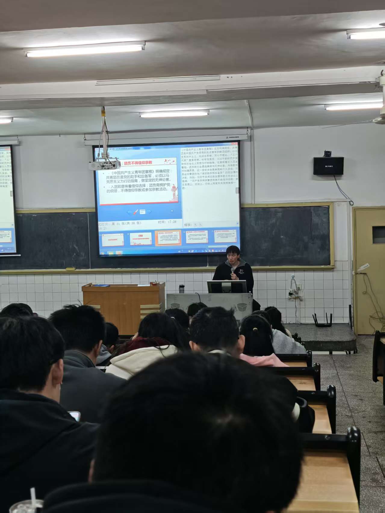 活动的最后环节,李政同学就“共青团员不能信仰宗教”这一政治原则作了专题学习,他号召全体同学,要自觉用党的创新理论武装头脑,树立科学的世界观、人生观和价值观,在面对复杂社会现象时能够明辨是非、保持定力,始终做到“党有号召、团有行动”,争做一名信仰坚定、纪律严明的新时代青年。